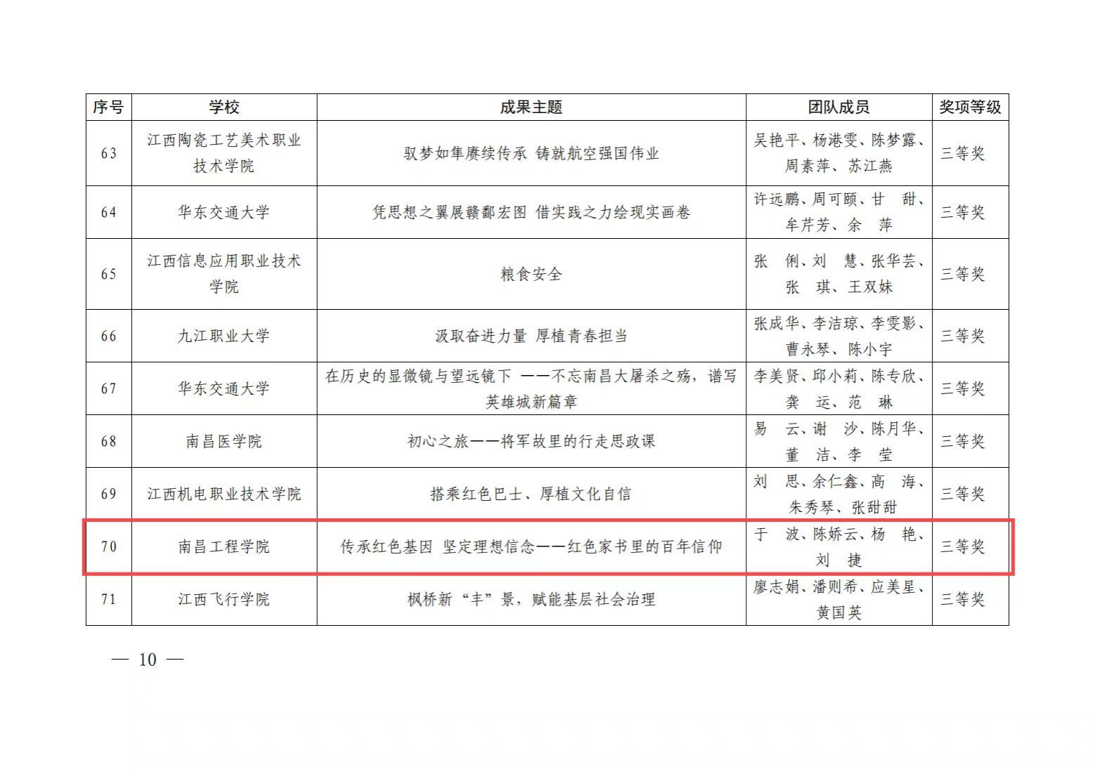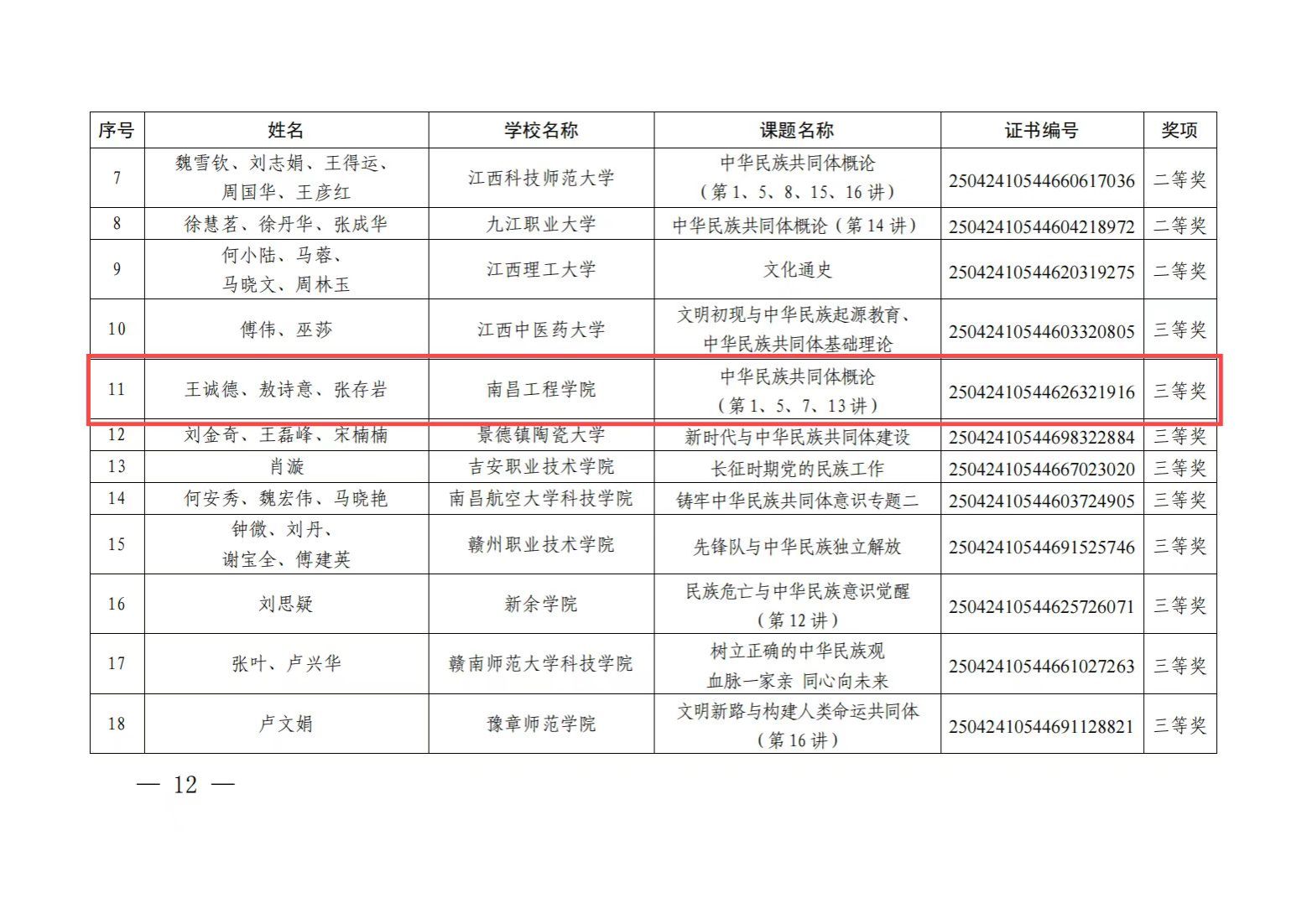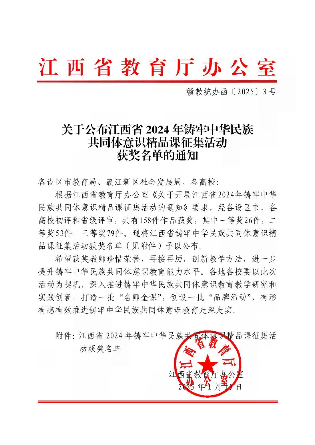 近日,省教育厅公布了2024年全省高校思政课教师“一线课堂”优秀成果评选结果和铸牢中华民族共同体意识精品课征集活动获奖名单。公司于波、陈娇云、杨艳、刘捷的教学实践成果《传承红色基因 坚定理想信念——红色家书里的百年信仰》获全省高校思政课教师“一线课堂”优秀成果三等奖,张存岩、敖诗意、王诚德荣获铸牢中华民族共同体意识精品课征集活动高校专题组专题课三等奖。