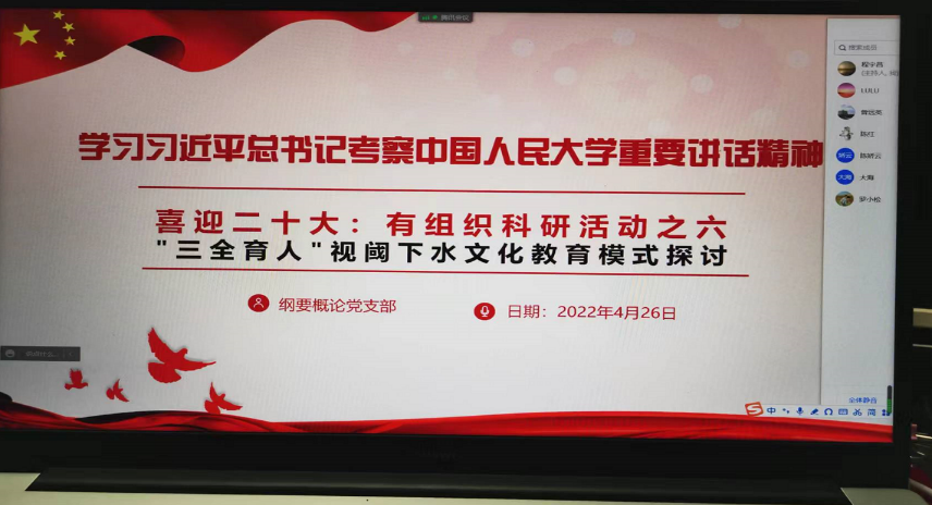 肖冬华博士就习近平总书记考察中国人民大学的重要讲话精神作了学习分享,同时,针对就组织科研活动,作了“‘三全育人’视阈下水文化教育模式探讨”的学术分享。大家围绕习近平总书记考察中国人民大学的重要讲话精神及肖冬华博士的“‘三全育人’视阈下水文化教育模式探讨”的报告作了深入交流。