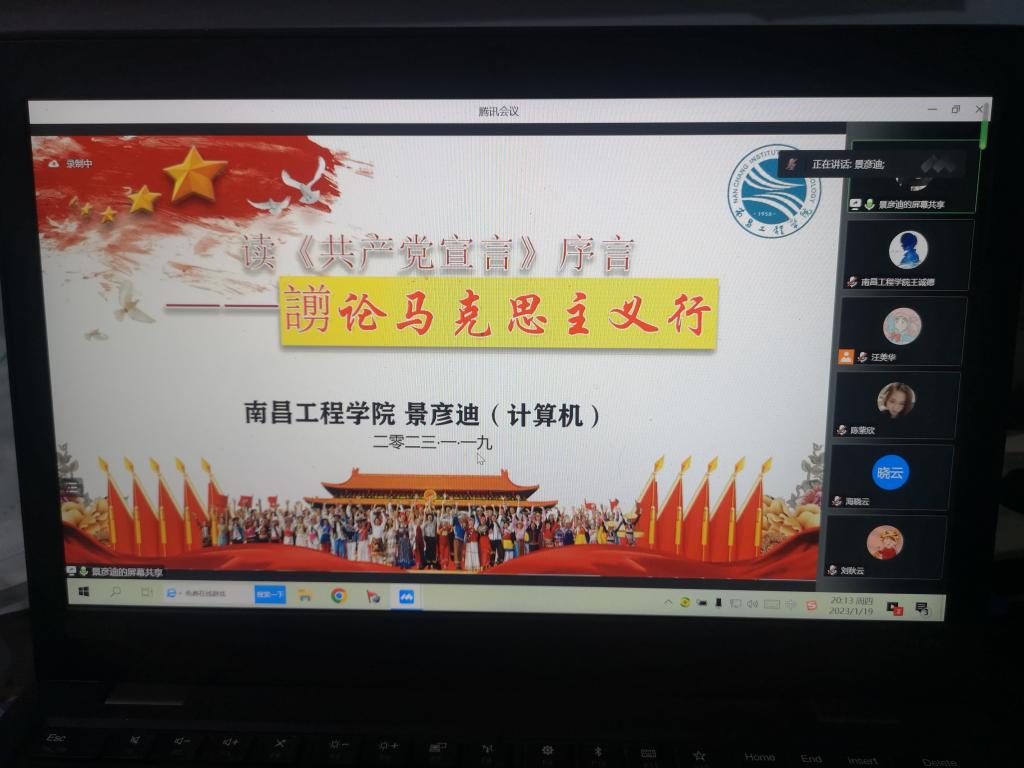 为了深入学习党的二十大精神,2023年1月19日晚,由bevictor伟德bevictor伟德、南昌航空大学bevictor伟德、江西科技师范大学bevictor伟德、宜春公司bevictor伟德、景德镇陶瓷大学bevictor伟德联合举办的原著品读线上活动顺利举行。来自上述五校的百余名师生参加了活动。公司2022级计算机专业研究生景彦迪做了题为《謭论马克思主义行——读<共产党宣言>序言》的学习交流汇报,得到了与会师生的一致好评。