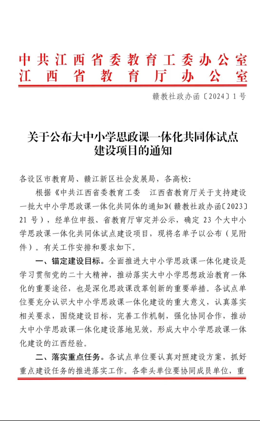 近日,中共江西省委教育工委、江西省教育厅发布了《关于公布大中小学思政课一体化共同体试点建设项目的通知》,公司牵头组建的“大中小学思政课一体化共同体”成功入选省级建设名单。