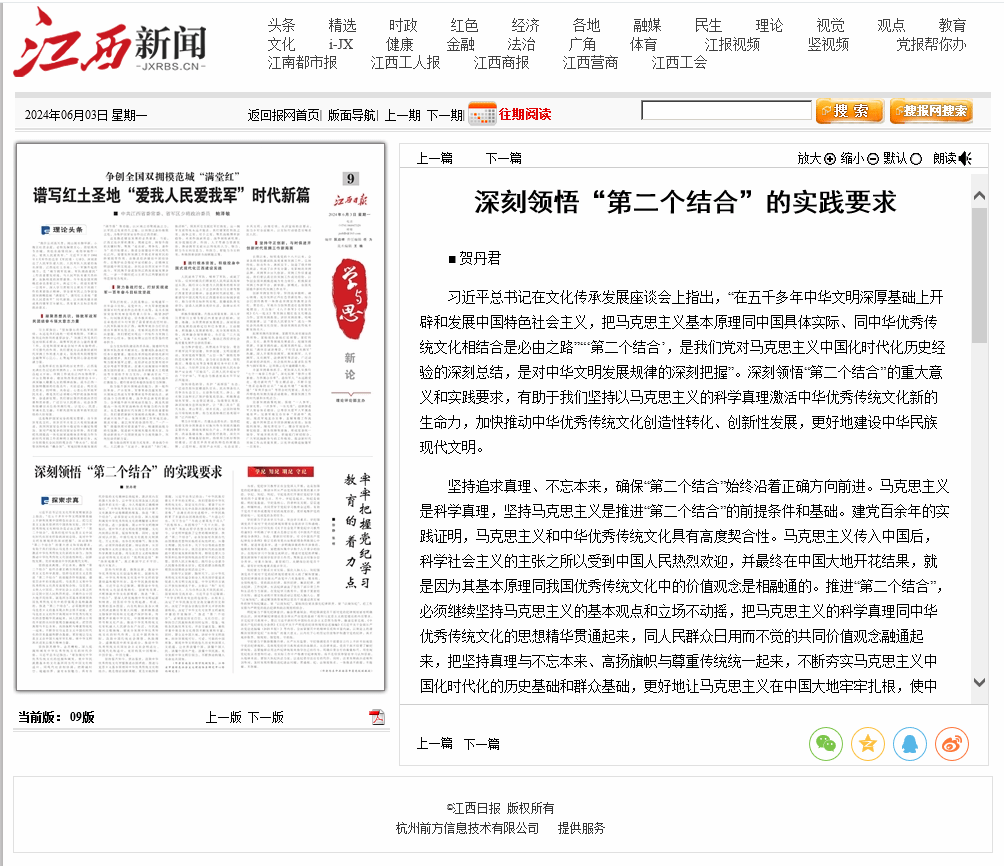 6月3日,《江西日报》理论版刊登bevictor伟德党委委员、副董事长贺丹君的理论文章《深刻领悟“第二个结合”的实践要求》。