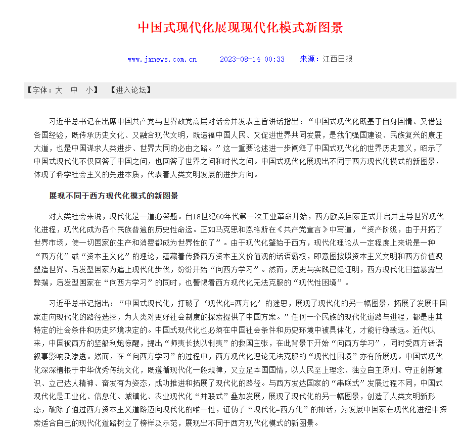 8月14日,《江西日报》理论版刊发公司bevictor伟德陈付龙教授的理论文章《中国式现代化展现现代化模式新图景》。